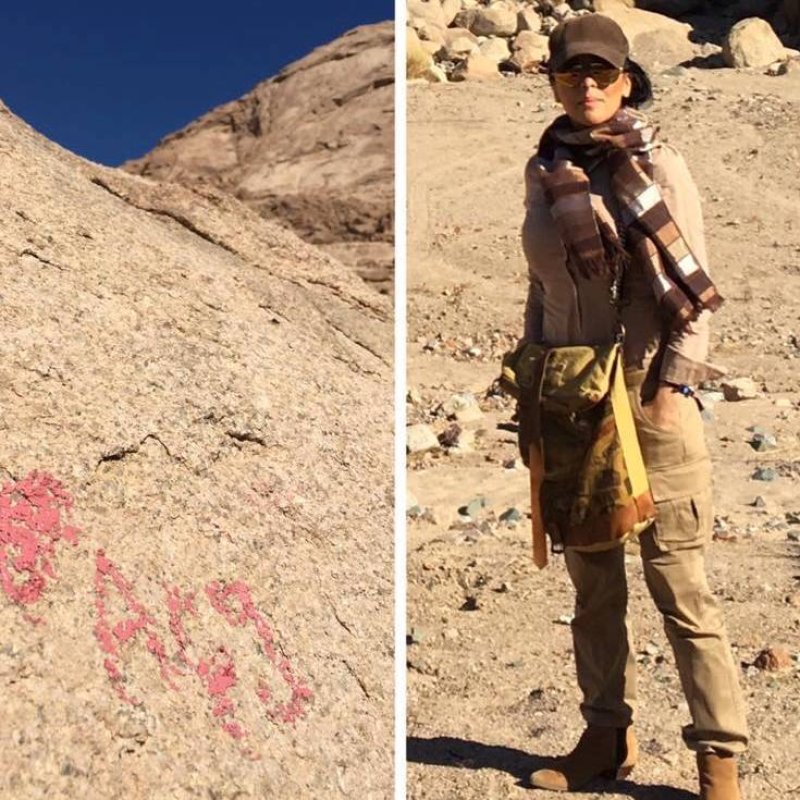زرغونه منگل در کوه سینا در مصر. او در توضیح این تصویر، آورده بود در جایی که ایستاده، کلمه ی معزز «افغان» را نوشته اند.
