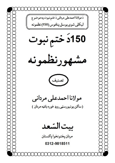 دفاع عقیدۂ ختمِ نبوت سے متعلق ایک سوپچاس پشتو نظمیں ۔ ۔۔۔۔مولانا احمدعلی مردانی کی دیگر تصانیف کی طرح یہ بھی ایک منفرد کاوش ہے ۔ مولانا موصوف نے اس کتاب میں عقیدۂ ختمِ نبوت کی اہمیت اُجاگر کرنے کے لیے ایک سوپچاس نظمیں تحریر کی ہیں اور شاید ہی کوئی ایسا شاعر وادیب ہو جس نے اس قدر کثیر تعداد میں عقیدۂ ختمِ نبوت سے متعلق نظمیں تحریر کی ہوں ، مولانا کی یہ کاوش یقینا اپنی مثال آپ ہے ۔ اُمید ہے کہ قارئیں اور نعت خواں حضرات اس سے ضرور استفادہ فرمائیں گے ۔ ۔۔۔۔۔۔۔۔۔۔۔ اللہ کریم سے دُعا ہے کہ وہ موصوف کی مذکورہ کاوش اپنی بارگاہ میں شرفِ قبولیت سے نوازے ۔ آمین یاربّ العٰلمین۔۔۔۔۔۔۔۔۔۔ وصلی اللہ تعالیٰ علیٰ خیر خلقہ محمد واٰلہ واصحابہ اجمعین
