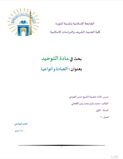 يتناول البحث موضوع *العبادة وأنواعها*، وقد بُيِّن في المقدمة الفرق بين عبودية الإنسان للإنسان التي تُذلّ وتُهين، وعبودية الإنسان لله تعالى التي تعزّه وتحرّره من كل طاغوت.
