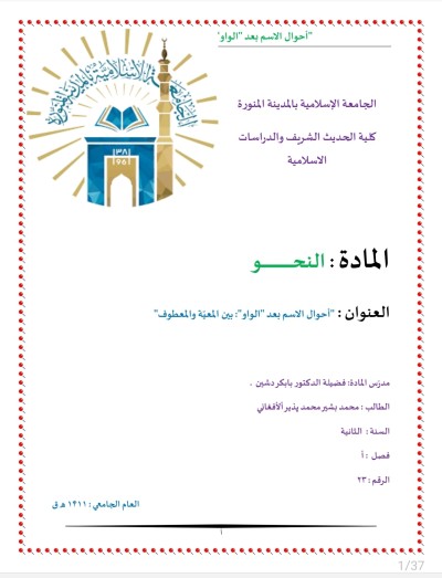 يحمد الكاتب الله تعالى على نعمة الإسلام والقرآن، ويصلّي على النبي محمد ﷺ، ثم يفتتح بحثه بتوضيح أهمية موضوعه، وهو: *"أحوال الاسم بعد الواو: بين المعية والعطف"*، ويُبرز أن هذا الموضوع من القضايا النحوية الدقيقة التي تؤثر مباشرة في الإعراب والمعنى.