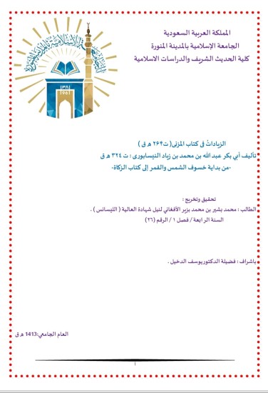 يتناول هذا البحث تحقيق كتاب «الزيادات على كتاب المزني» للحافظ أبي بكر النيسابوري، مع تخريج أحاديثه وآثاره ودراسة أسانيدها وفق منهج المحدثين في النقد والتمحيص. وينطلق العمل من بيان مكانة السنة النبوية ووجوب العمل بها، وضرورة العناية بها تحقيقًا وتخريجًا؛ صيانةً لها من الخطأ، وتمييزًا لصحيحها من ضعيفها.