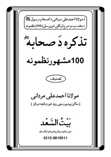 تذکرۂ صحابہؓ پشتو نظمیں( ایسی نظمیں جس میں مدحتِ اصحابِ رسول ﷺ بیان کیا گیا ہے) ایک سو نظموں پر مشتمل مولانا احمدعلی مردانی کی ایک منفرد کاوش ہے جس کے ذریعے موصوف نے اصحابِ رسول ﷺ کے مقام کو اُجاگر کرنے کی کوشش کی ہے ۔ اور یقینا پشتو زبان شاید پہلی دفعہ ایسا ہوا ہوگا کہ کسی ایک ہی شاعر نے اتنے کثیر تعداد میں مدحت اصحابِ رسول ﷺ میں اشعار کہے ہوں ۔ اللہ کریم موصوف کی کاوش کی شرفِ قبولیت سے نوازیں ۔ آمین